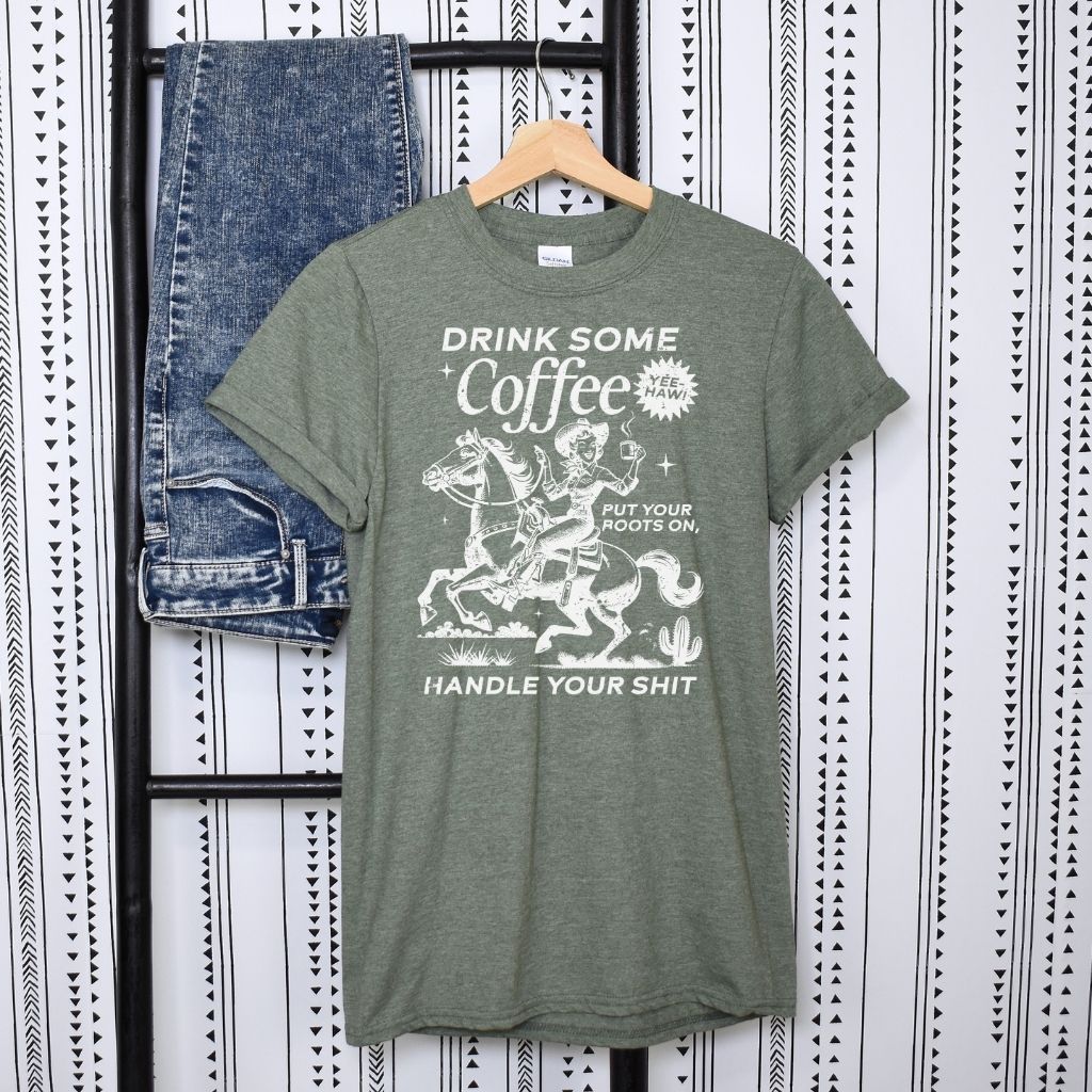 Start your day with attitude and a whole lot of comfort. The Drink Some Coffee Put Your Boots On, Handle Your Shit T-Shirt is your go to graphic tee for bold mornings, busy days, and everything in between. Made from a super-soft polyester and cotton blend, this tee feels light, breathable, and insanely comfortable from the first wear. The playful, no-nonsense design adds instant personality to any outfit while keeping things effortless and fun.